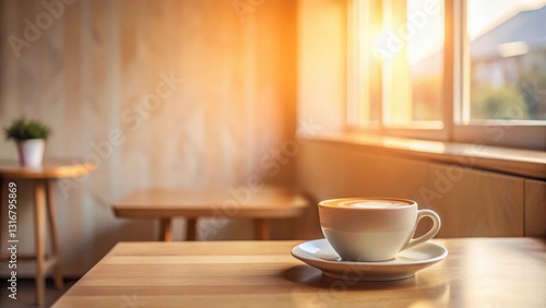 Warm Morning Light Illuminates a Single Cup of Coffee on a Wooden Table in a Cozy Cafe Setting