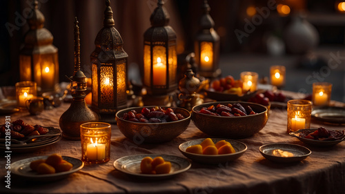 Warm Ramadan feast setting with dates candles and ornate lanterns creating a serene ambiance Iftar dinner time
