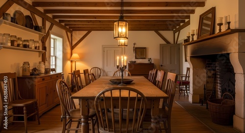 Warm, Rustic Dining Room: Antique Table, Candlelight, and Exposed Beams.
