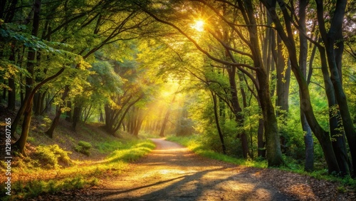 Warm sunlight filters through leafy branches above a winding forest path, casting dappled shadows on the earth below, sunlight filter, woodlands