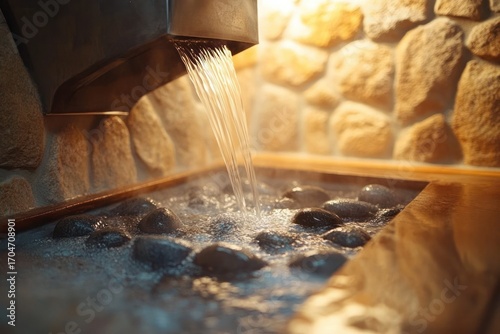 Warm water flowing from a metal spout into a wooden bath filled with smooth black stones with a softly lit stone wall background creating a calming atmosphere