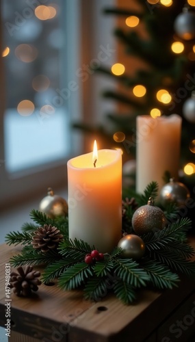 Warm white candle illuminates natural Christmas decorations on wooden table , background, light background, decor