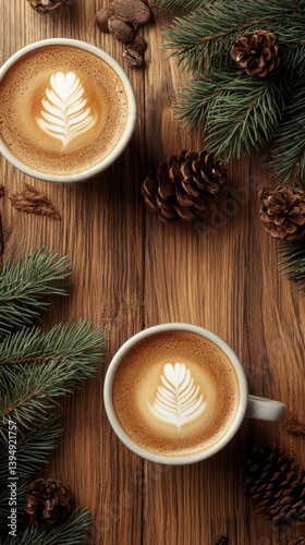 Warm Winter Morning Two Cups of Coffee Latte Art Pine Cones and Evergreen Branches on Rustic Wood Tabletop