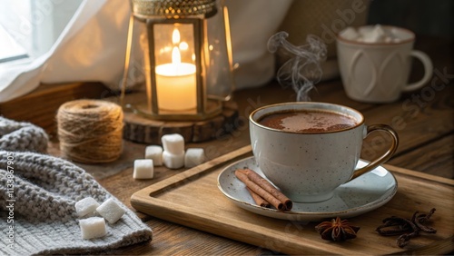 Warmth and Cozy Comfort A Steaming Mug of Hot Cocoa with Cinnamon Sticks and Sugar Cubes on a Wooden Tray Beside a Lit Lantern and Knitted Blanket