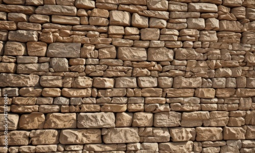 Warm-toned stacked stone wall, horizontal view Various sized stones, sunlight shadow , design, masonry