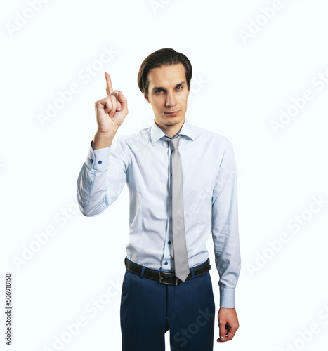 Warning concept wih young handsome man in white shirt with raising hand and forefinger isolated on light wall background, closeup