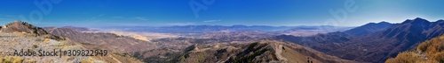 Wasatch Front Rocky Mountain landscapes from Oquirrh range looking at Utah Lake during fall. Panorama views near Provo, Timpanogos, Lone and Twin Peaks. Salt Lake City. United States.