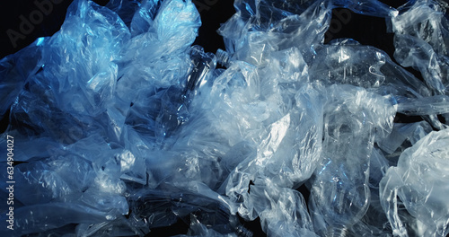 Waste management. Plastic recycling. Used wet empty cellophane polyethylene transparent bags crushed bottles garbage rubbish on dark background.