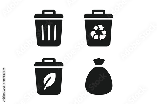 Waste management vector icon set. Solid glyphs of trash can, recycling bin, compost container, and garbage bag. For ecology, sorting, and environmental design concepts.