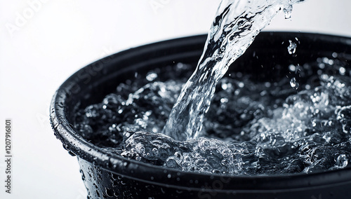 Water being poured into an empty black bucket, white background