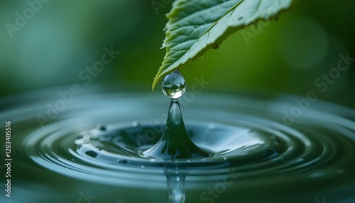 Water Drop Falling From Leaf Creates Ripples in Water Surface