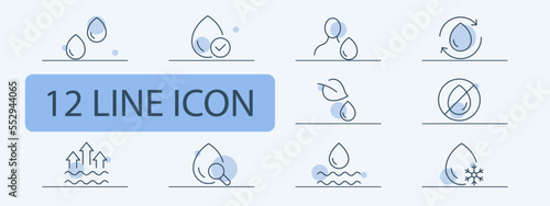 Water drop set icon. Freezing water, thirst, tick, wave, drinking water. Save the water. Beverage concept. Pastel color background. Vector 12 line icon for business