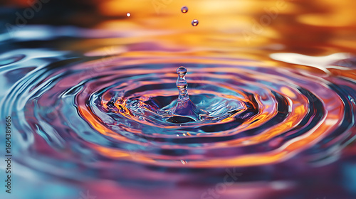 Water droplet creating looping ripple across glassy colorful surface with vibrant orange and blue reflections, capturing dynamic fluid motion