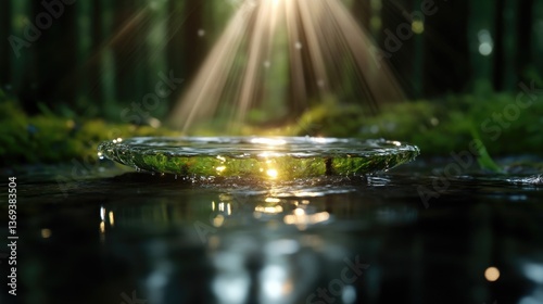 Water droplet impact in a forest setting. Sunlight beams through the trees, illuminating a circular water splash