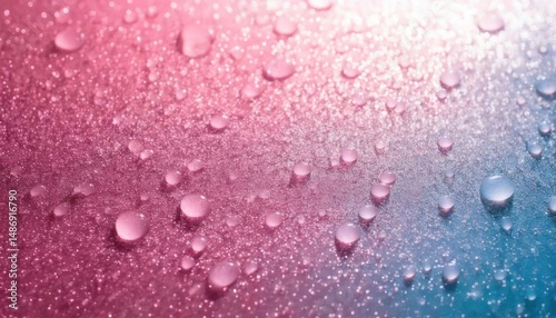 Water droplets on a pink and blue surface create a sparkling abstract background with a fresh, vibrant look.