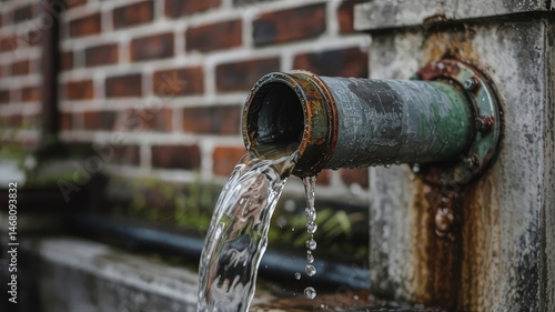 Water Flowing: A weathered, metallic pipe releases a clear, flowing stream of water. The image showcases a close-up view of an old brick wall.