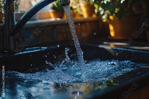 Water flowing from a faucet into a sink. Perfect for illustrating articles about hygiene, cleanliness, or home improvement.