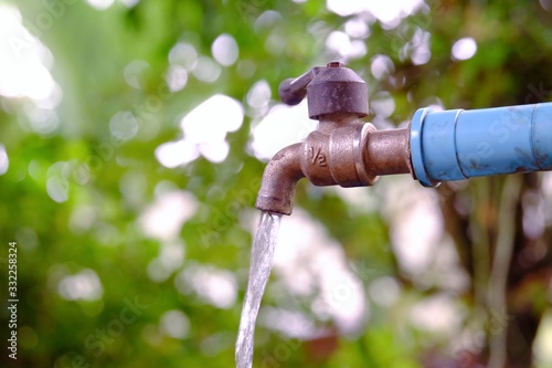 Water flowing from old steel faucet in outdoor space with blur green leaves background for saving water concept
