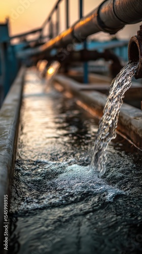 Water flowing from pipes into a tranquil canal at sunset in an industrial setting