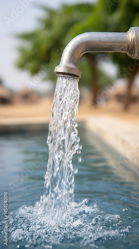 Water flows from a metallic faucet into a clear pool during a sunny day in a garden