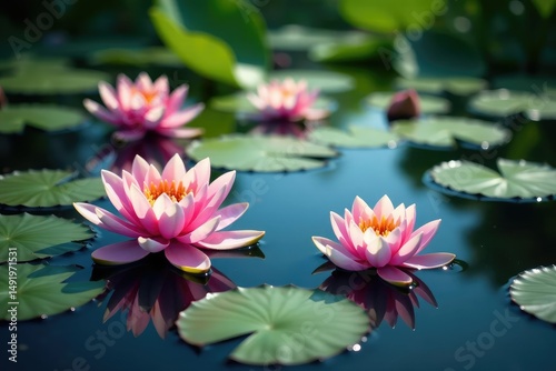 Water lilies and blossoms create a floral pattern across a still lake, bright, shadow, orange