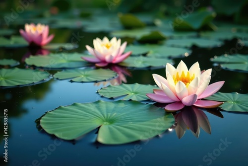Water lilies creating a floral pattern across a still lake, colorful, texture