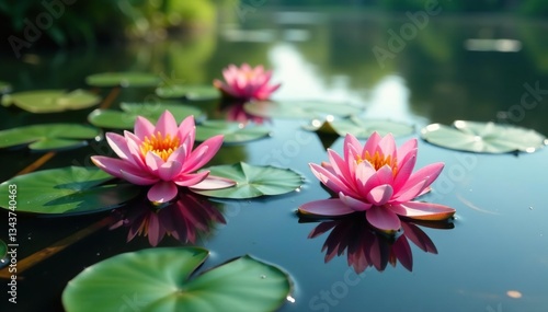 Water lilies form a natural floral pattern on a still lake, macro, flowers, image