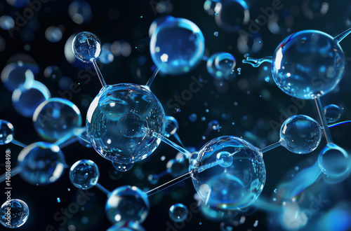 Water, molecule and atom for genetic or science with futuristic development in biology. Dna, chemistry and nucleotide with cells or rna for virus or disease on research, biomolecule and particles