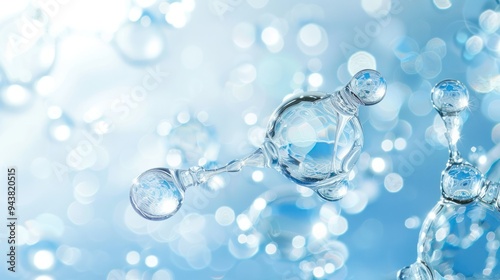 Water molecules and closeup of water on a light blue white gradient background, light gray tone, transparent glass material.