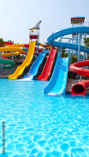 Water park with colorful slides and pools, smooth light. with white shades