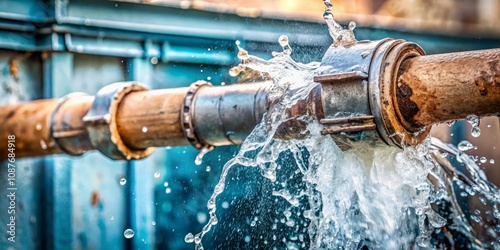 Water Pipe Burst Close-up Composition, Splashing Water, Rusted Metal, Pipeline Leak, Water Damage Pipeline failure, water leak