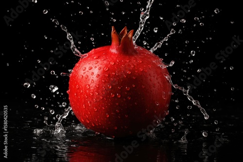 Water splashes and droplets on pomegranate against a monochrome backdrop with studio illumination