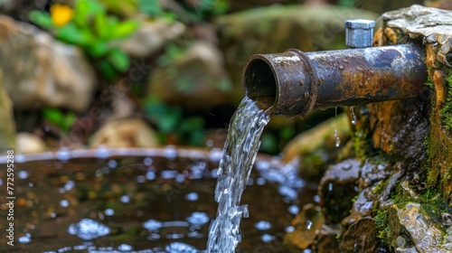 Water supply on a water field, drain. Clean water flows from a pipe