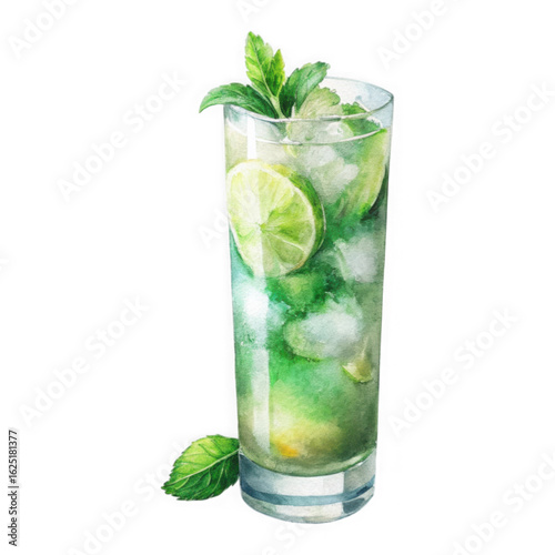 Watercolor illustration of a refreshing mojito cocktail with lime slices and mint leaves isolated on transparent background