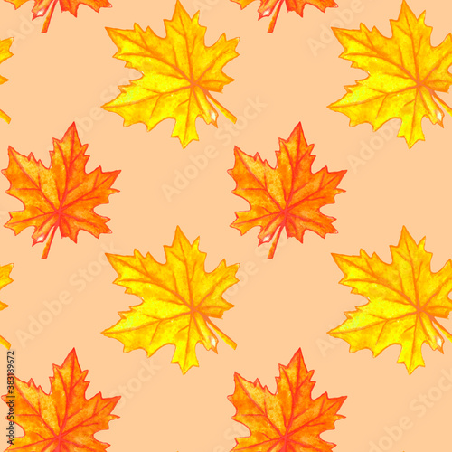 Watercolor autumn maple leaves seamless pattern. Colorful fall background and texture