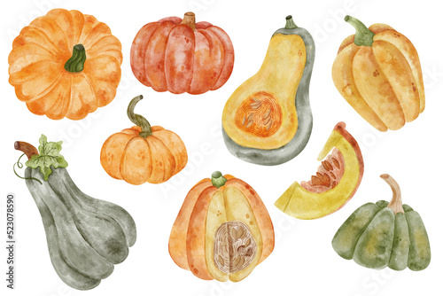 Watercolor autumn pumpkin set on white background. Fall vagetables for harvest or autumn design