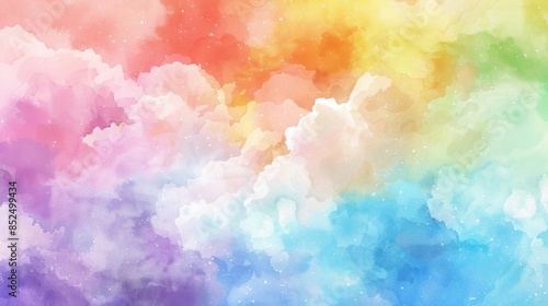 Watercolor background with clouds and rainbow hues.