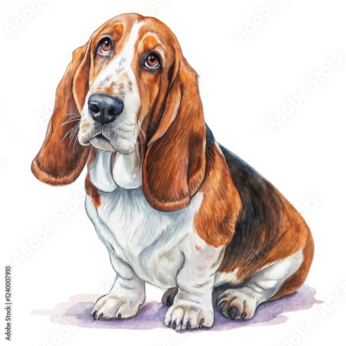 Watercolor Basset Hound Portrait Sitting Pose, Detailed Fur, Sad Expression, Pet Art, Dog Painting Basset Hound, Watercolor Painting