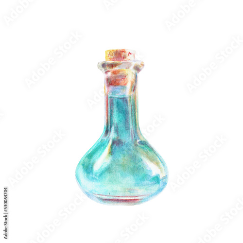 Watercolor blue flask with potion isolated on white background. Illustration for label, tag, mystic prints.