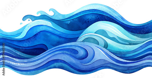 Watercolor Blue Waves, Isolated on Transparent Background, Abstract Blue Waves