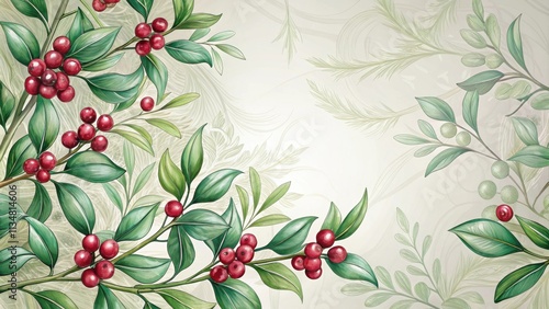 Watercolor Botanical Illustration with Lush Green Foliage and Vibrant Red Berries on a Delicate Background