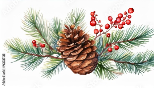 Watercolor Coniferous Twig with Pine Cone and Red Berries - Holiday Winter Decoration - Seasonal Botanical Art on White Background
