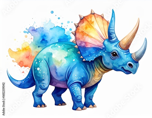 Watercolor depiction of a colorful triceratops, charming and whimsical style
