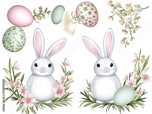 Watercolor Easter Bunny Illustration With Pink And Green Floral Decorations And White Rabbits With Easter Eggs On Transparent Background