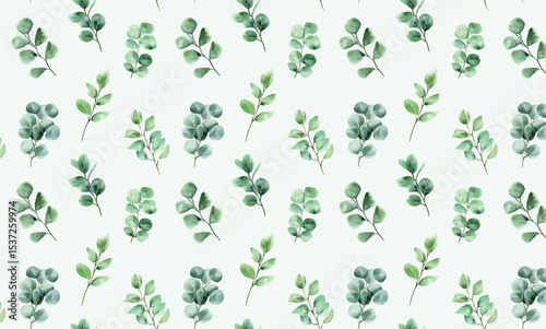 Watercolor eucalyptus branches pattern. Watercolor green eucalyptus branches in the background. Elements of a seamless pattern with watercolor green branches for wedding designs. Vector illustration.