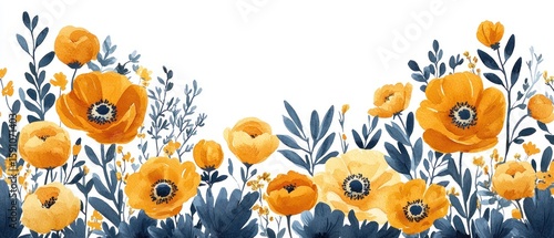 Watercolor floral border featuring a vibrant arrangement of yellow and orange poppies, complemented by dark blue-grey foliage, creating a striking contrast against a white background