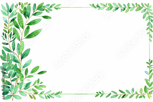 Watercolor green leaves frame. Herbal eucalyptus border. Green leaves and branches on white background. Simple minimalistic design for card, invitation, poster, save the date, wedding or greeting