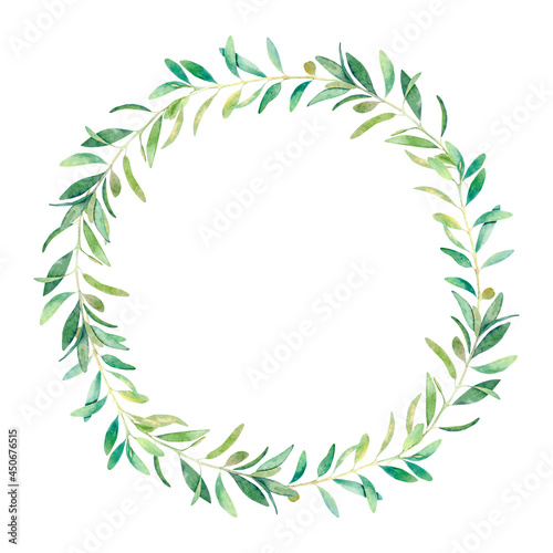 Watercolor hand drawn wreath with olive branches on white background. Isolated botanical round frame with olive leaves for wedding, cards, invitations and textile.