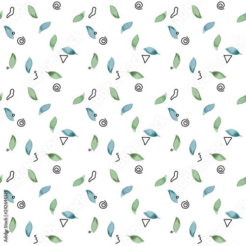 Watercolor hand-painted simple botanic leaves with graphic elements seamless pattern on white background