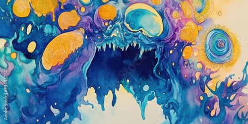 Watercolor illustration featuring surreal ink fluid with a psychedelic nightlife theme Iridescent shapes and blue exotic elements create a club concept complemented by yellow traditional ornaments